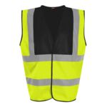 High visibility Class 2 warning vest with 2 bands of reflective tape around torso and one brace over each shoulder. Safety tape, Velcro front fastening for easy access and grey polyester bound edges with reflective tapes, Velcro front fastening and black polyester bound edging. Also available in kids’