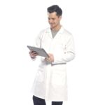 Back vent. 1 breast pocket. Concealed stud front. 2 lower patch pockets. Length 100cm.