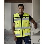 Heavy-duty, hi-vis ripstop tool vest with multiple pockets for convenience at work. Two double pockets accessed from the top with zip and hook and loop closure. Double D rings. Chest pockets with flap closure and pulls. ID card display. Adjustable hem with two press buttons. Also available with open mesh on the bottom to provide better breathability and comfort in hot working environments and seasons. Conforms to EN ISO20471:2013 Class 2. Large decoration area on the back. Certified Sedex and OEKO-TEX®.